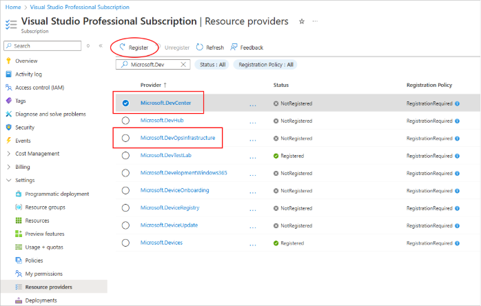 Om een MDP aan te kunnen maken, moet je eerst de resource-providers Microsoft.DevCenter en Microsoft.DevOpsInfrastructure voor jou Azure Subscription registreren. Hiervoor ga je in Azure naar Subscriptions en selecteer je de subscription waar je de Dev Center in wil aanmaken. In het menu, kies je vervolgens onder Settings voor Resource Providers. Zoek hier op ‘Microsoft.Dev’ om de providers te vinden. Selecteer één voor één de providers en klik op ‘Register’. Binnen enkele ogenblikken zou de status op ‘registered’ moeten komen te staan.