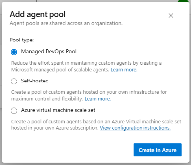 We zijn nu klaar om een Managed DevOps Pool aan te maken. In Azure DevOps, ga je naar de settings van je Organization of een Project en klik op Agent pools. Klik op Add pool om een pool toe te voegen. In de popup, is een nieuwe pool-type beschikbaar: Managed DevOps pool. Selecteer deze en klik vervolgens op Create in Azure.