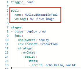 Het enige dat nog rest, is om de agent pool te gebruiken in een pipeline. In je pipeline geef je de pool naam aan zoals deze in Azure DevOps bekend is. Wanneer je bij het opzetten van de MDP in Azure meerdere images beschikbaar hebt gemaakt, moet je ook de image opgeven zoals je op de afbeelding ziet.