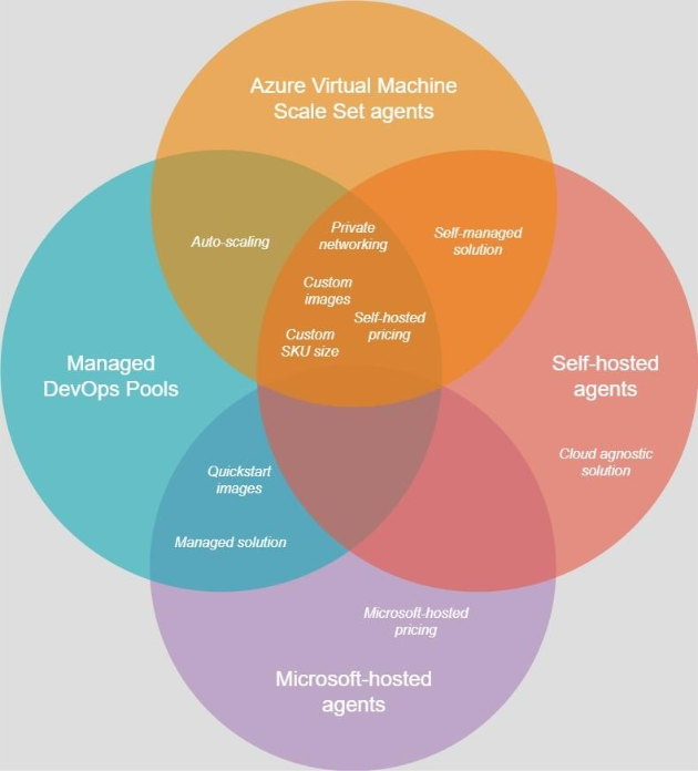 Onderstaand diagram geeft een overzicht van de verschillende opties die je hebt om agents binnen Azure DevOps te gebruiken en welke unieke en overlappende eigenschappen en/of voordelen de verschillende opties hebben.