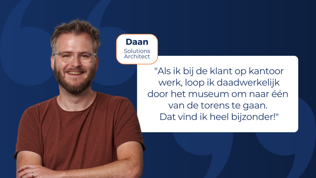 Als liefhebber van kunst en klassieke oudheden, is het volgens Daan een feestje om in het Rijksmuseum te werken. “Als ik bij de klant op kantoor werk, loop ik daadwerkelijk door het museum om naar één van de torens te gaan. Dat vind ik heel bijzonder. We beginnen vaak met een dagstart, waarin we aangeven wat de plannen zijn en welke impediments (belemmeringen) er zijn. Vervolgens doen we natuurlijk stukjes development en houden we sessies om de architectuur verder uit te werken.”