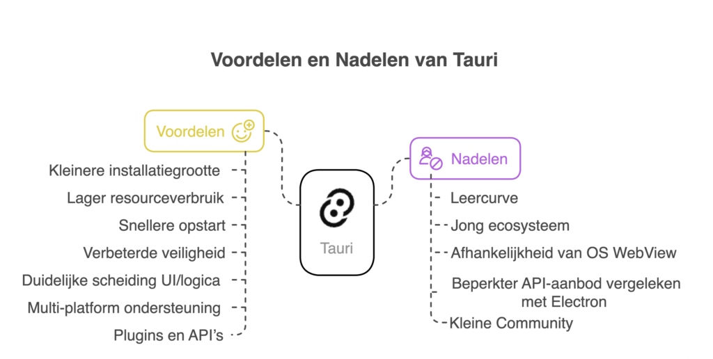 - Veiligheid – Tauri gebruikt Rust als backend, wat zorgt voor memory safety en een veiliger model waarin expliciet moet worden aangegeven welke functionaliteiten beschikbaar zijn. Updates voor WebView worden bovendien door het OS beheerd.